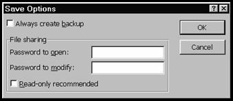 Options saves in different file formats like Lotus 1-2-3, BIFF, Multiplan etc. Always Create Backup File will make a backup file. You can keep people from accessing the spreadsheet by typing in a password in the Protection Password box. Typing a password in Write Reservation Password will give Read access to anyone but Write access to only people with the password. Read-Only Recommended brings up a dialog box to remind users to open a file Read-Only. Ø   17317i84r ;   17317i84r ;   17317i84r ;   17317i84r ;