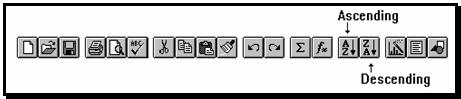 the Descending Sort tool Ø   17317i84r ;   17317i84r ;   17317i84r ;   17317i84r ; The rows are sorted in order based on the column that contained the active cell. With Sort, from the Data menu you can specify up to three sort keys and sort by either rows or by columns. The sort key identifies which column to sort by when sorting rows, or which row to sort by when sorting columns. You can refer to any cell in a row or column to identify that row or column as a sort key. When you use more than one sort key, columns or rows with the same entry for the first key are sorted according to the second and third keys. If you have not identified second and third keys, rows or columns with duplicates in the first key are left in the order in which they are found. Ø   17317i84r ;   17317i84r ;   17317i84r ;   17317i84r ; Save your database on the A:\ drive and close this document.