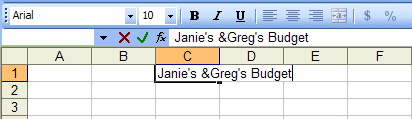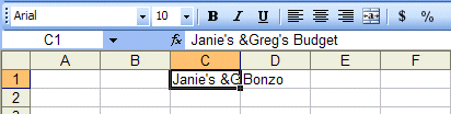 Notice how Bonzo now COVERS the right part of your original entry!! Now move back to cell C1 and click-on it. Look at the upper part of the spreadsheet, just above the cells where you typed Bonzo. Your name and the word budget are still there! Bonzo only COVERED the portion in cell D1. See the image and arrow below.