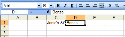 There are several ways to take care of this. For the moment move back to cell D1 and click-on cell D1. Tap the Delete key (above the arrow movement keys on the keyboard). Notice that Bonzo disappears and your entire entry reappears. This is one way to expose the entry. We'll look at some others as we go along.