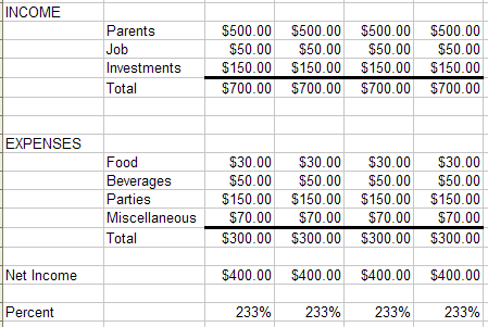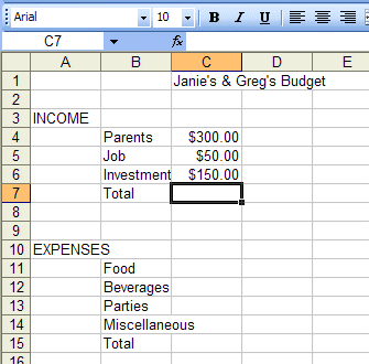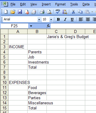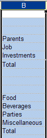 At this point you probably have noticed, the words "Investments" and "Miscellaneous" run over the spaces given in the cells. Do not be concerned at this point. We'll soon fix this.