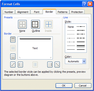 If the thick line does not show-up at the top of the Text box, click-again at the "top line area in the Text box" and the line will "disappear". Then click-on the thick, single line in the Line Style box again and repeat the previous instructions. If, somehow, you make a mistake, simply click "on and off in the Text line boxes." You will notice that the lines appear and disappear. This is called a "toggle" in computer jargon. So, work at this until you get the line on the top or where you want it. We have just indicated that we want a single thick underline at the top of the cell C7. Point to OK and click the left mouse button.