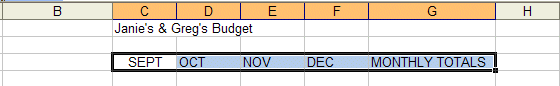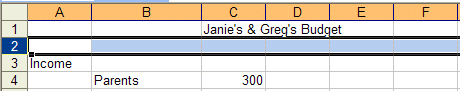 Oops... a mistake (on purpose). We haven't left enough room at the top of the spreadsheet to insert some budget months. So... move the cursor to the gray 2 along the left edge (this is the second row) so we can insert two new rows. Click the left mouse button. You will notice that the whole row goes light blue and the 2 turn's dark blue. Make sure the cursor arrow is either on the 2 or somewhere in the blue row.
