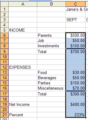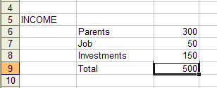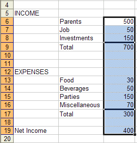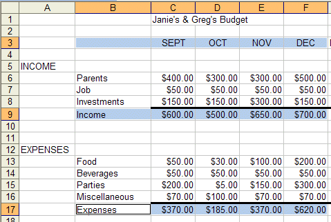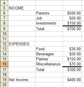 First: in cell B9 type-in Income (to replace the word Total). Next, type-in Expenses in cell B17 for the same reason.