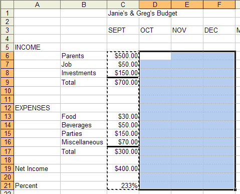 Something new.... Hold down the left mouse button and highlight cells B3 to F3. Next HOLD DOWN the Ctrl key at the bottom of the keyboard, and while you are holding it down, highlight cells B9 through F9. You will now see two "ranges" highlighted. Hold down the Ctrl again, and highlight cells B17 through F17. These three ranges will make up your chart. The x-axis will be made up of B4 - F4. And, the two sets of bars (series) will make-up Income and Expense. When you complete the above instructions, your screen should look like the one below.