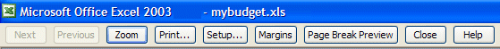 Notice that the Next and Previous buttons at the left end of the bar are not highlighted with text - they are just gray. This means that the buttons are not "active." This indicates that we are OK with our spreadsheet - it is all on one page. If we saw that the Next button was active, this would mean that there are other pages to our spreadsheet. If you'll look at the lower left corner of the Print Preview screen you'll see: Preview: Page 1 of 1. This confirms that our spreadsheet is on one page. If you do not see this "combination," we'll show you how to take care of it later.