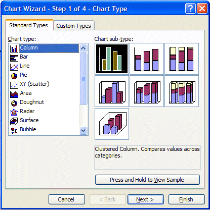 Examples of the selected chart type show on the right under Chart sub-type. We'll stay with Column and the chart selected for now.
