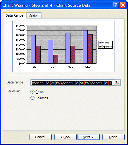 The Wizard (on the last page) shows you what your chart will look like. The "ranges" you selected originally are shown in the Data range: area. If you did not highlight as indicated, your chart won't "look right." Your chart should look like the example above. If you click-on the Series tab at the top of the Wizard screen, you'll see a new Wizard screen that shows you where the Income and Expenses series came from. Click-back on the Data range tab at the top. Now click-in the little circle in front of Columns. The Wizard will indicate that the chart has been "rotated" 90 degrees and thus the axis has changed. This is often called a "pivot." Click-back in the small circle in front of Rows. Click Next again.