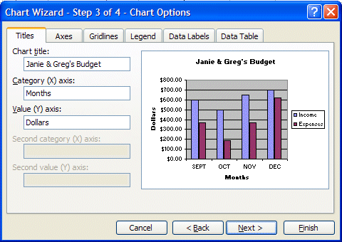 The Chart Wizard Step 3 of 4 menu will appear: Titles (similar to the image above). Click-in the blank area under Chart Title. A flashing cursor will appear. Type-in your name with an apostrophe (') s and the word Budget (ex. Janie's Budget). Now, click-in the area under Category (X) axis: and type in Months. Next, click-in the area under Value (Y) axis: and type in Dollars. You probably noticed that as you entered these titles, the chart in the area on the right of the Wizard changed to give you an "instant" preview of your final chart. You will also notice that there are several tabs at the top of the Wizard. Click-on each of the tabs and see what "they do". Notice how some change axis and put in grid lines. The legend is the small box on the right, which indicates what the colors of the "bars" represent (Income and Expenses). Click Next one last time. The Step 4 page of the Wizard will now appear (image at the top of the next page)