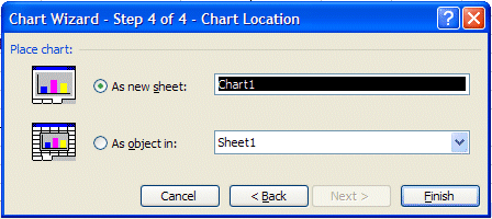 This is the final Wizard page. You'll notice that it asks you where you want to put your chart. Since this is your first chart, it is best if you select As a new sheet: (see arrow above). This will put your chart on a new tab called Chart 1. Now click-on Finish, You'll see that you chart has a tab of its own at the bottom of the screen, and "fills" an entire screen.