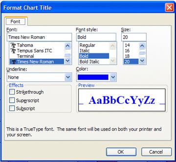 Change the Font to Times New Roman (by moving up and down with the arrows) or any font that you like. As you change things you will see the results in Preview on the lower right. Change the size to 20. Change the color if you want. Click OK. Your title should look something like the one below.