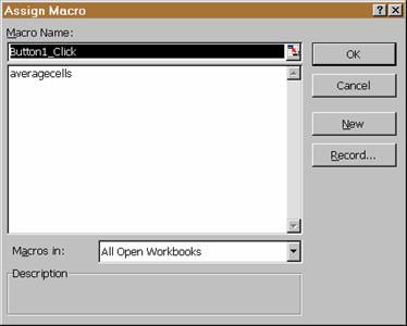 Click on the 4th from the left (the button icon) and draw a button on the worksheet in some convenient place (NB if you hold down the ALT key while you draw the button it will automatically size itself to the cells). As soon as you release the left mouse button, a dialog box will appear: