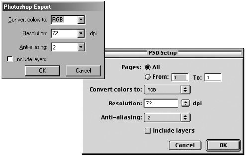 Exporting as PNG, GIF, and JPEGThe other three raster formats, PNG, GIF, and JPEG are primarily used for Web graphics. Their export options are covered in Chapter 28 Moving to the Web |