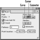 In the Object inspector, click the Point type icons for Curve point, Corner point, or Connector point