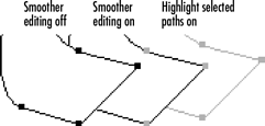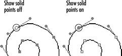 Show solid points reverses how FreeHand displays selected and unselected points. When this option is off, selected points are hollow. When it is on, selected points are solid