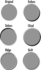 Click one of the top icons to choose from the five types of embossing effects: emboss, deboss, chisel, ridge, or quilt.