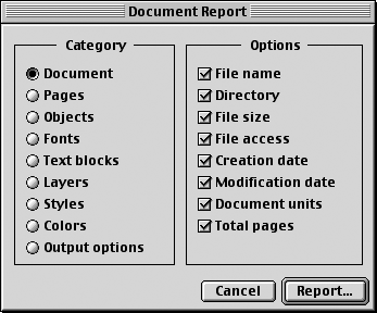 Information in each report categoryDocument: File name, Directory, File size, File access, Creation date, Modification date, Document units, Total pages Pages: Page location, Dimensions, Bleed size, Orientation, Page type Objects: Set Note, Halftone, Place file Fonts: Font name, Font PS name, Font file format, Font style, Font size Text: Blocks Fonts used, Color used, Bounding box, Line count, Paragraph count, First line Layers: Foreground layers, Background layers, Visibility, Editing color, Acess, Preview status Styles: Graphics styles, Text styles Colors: Named colors, Separations Output Options: Invisible