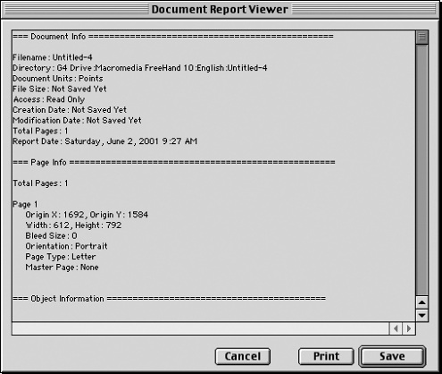 If you send your document to be printed by someone else, it is handy to have a record of all the information about the file. FreeHand provides you with a very sophisticated report for all your documents.