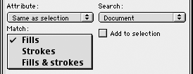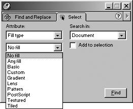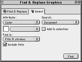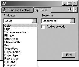The other tab of the Find and Replace dialog box opens the Select panel. Although not quite as powerful as the other side of the panel, the Select commands let you find many more types of objects. Once you have found the objects, you can manually change them, or move them to separate layers, or apply styles to them.