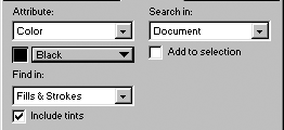 Set the Find in list to find only fills, only strokes, or fills and strokes.