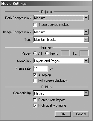 There are three different areas in the Movie Settings dialog box . The first area, Objects, controls the appearance of the FreeHand objects, text frames, and raster images that are exported into the Flash format. The second area, Frames, controls the actual animation of the movie. The final area, Publish, controls how the Flash file is created.