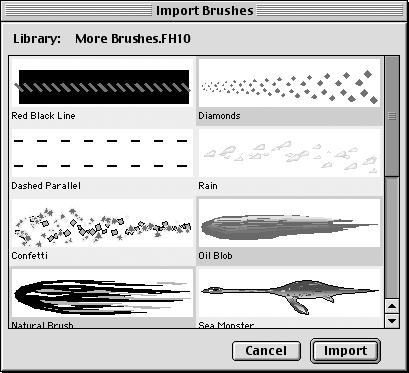 What's Imported with the Brushes?When you import a brush into a file, you also import any named colors that are used in the artwork for the brush. You also import any symbols that are used as the brush tip. |