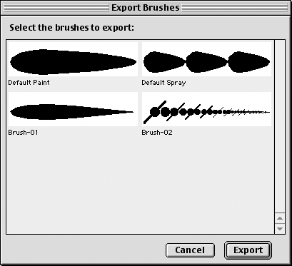 With Brush chosen in the Stroke inspector list, choose Export from the Stroke inspector menu. The Export Brushes dialog box appears