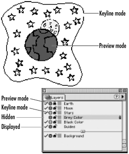 You can also use the Layers panel to change the preview for the objects on each layer. This is especially helpful if you work with very com plicated illustrations and need to select just certain elements.