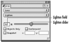With Lens chosen, choose Lighten from the mode pop-up menu. This causes the selected object to lighten the colors in the objects it passes over . This is similar to adding white to the colors
