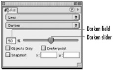 With Lens chosen, choose Darken from the mode pop-up menu . This causes the selected object to Darken the colors in the objects it passes over . This is similar to adding black to the colors.