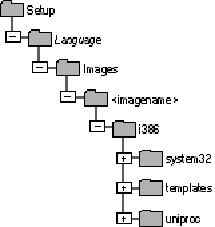 Installing a Risetup image is similar to setting up a workstation directly from a CD, however, the source files are located across the network on a RIS server. Figure . shows the directory structure of your RIS server under the RemoteInstall folder where Risetup images are stored. You can define the name of the folder <imagename> where the images are located.