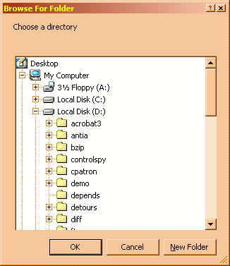And we are done with the filling of the structure! We just have to call our famous SHBrowseForFolder, and assign the result to ItemIdList. Here is an image of the user interface display that appears in a windows 2000 machine; in other versions of windows it will look different. The user interface is quite sophisticated, and it is all at our disposal without writing any code (well almost!). What is better; even if we had spent some months developing a similar thing, we would have to maintain it, test it, etc. Note that you can transparently browse the network, give a symbolic path like "My computer" or other goodies.