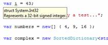 Now the code compiles and the type has been inferred. Move the mouse over var and the Quick Info shows the inferred type Int32[