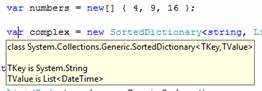 Implicitly typed variables become very useful as the type of the initialization expression becomes more complicated; in particular, when instantiating a complex generic type. In this task, you will return to the Main method and show how var is used to create more concise code: