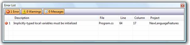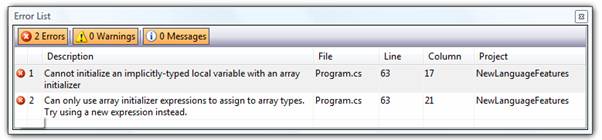 An implicit array initialization expression must specify that an array is being created and include new[ Also important to note when using implicitly typed local variables, the initializer cannot be an object or collection initializer by itself. It can be a new expression that includes an object or collection initializer.