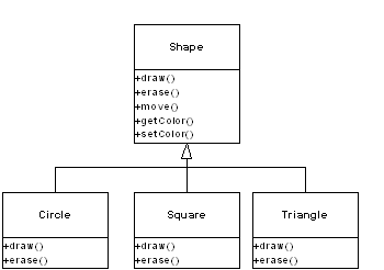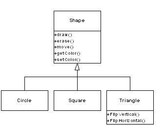 A second example is the classic shape problem, perhaps used in a computer-aided design system or game simulation. The base type is "shape," and each shape has a size, a color, a position, and so on. Each shape can be drawn, erased, moved, colored, etc. From this, specific types of shapes are derived (inherited): circle, square, triangle, and so on, each of which may have additional characteristics and behaviors. Certain shapes can be flipped, for example. Some behaviors may be different (calculating the area of a shape). The type hierarchy embodies both the similarities and differences between the shapes.