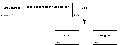 There's a problem, however, with attempting to treat derived-type objects as their generic base types (circles as shapes, bicycles as vehicles, cormorants as birds, etc.). If a function is going to tell a generic shape to draw itself, or a generic vehicle to steer, or a generic bird to fly, the compiler cannot know at compile-time precisely what piece of code will be executed. That's the whole point - when the message is sent, the programmer doesn't want to know what piece of code will be executed; the draw function can be applied equally to a circle, square, or triangle, and the object will execute the proper code depending on its specific type. If you don't have to know what piece of code will be executed, then when you add a new subtype, the code it executes can be different without changes to the function call. Therefore, the compiler cannot know precisely what piece of code is executed, so what does it do? For example, in the following diagram the BirdController object just works with generic Bird objects, and does not know what exact type they are. This is convenient from BirdController's perspective, because it doesn't have to write special code to determine the exact type of Bird it's working with, or that Bird's behavior. So how does it happen that, when fly( ) is called while ignoring the specific type of Bird, the right behavior will occur?
