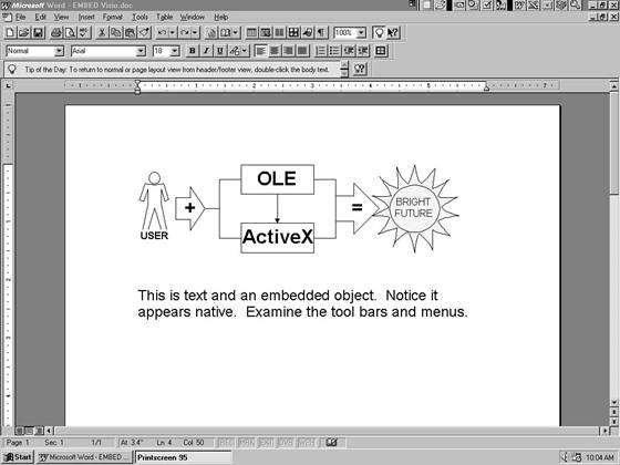 As a computer professional, I am sure you have seen or worked with Microsoft Word or Excel. Microsoft Word is the classic example of an OLE document. This chapter is not going to outline the functionality of Word, but merely point out the features of OLE. However, do not be deceived; OLE documents are not always classic word processors. It is easy to think so because of the word documents. Think of an OLE document as a piece of Velcro. You have two pieces: the hook side (the document) and the pile side (the document container).