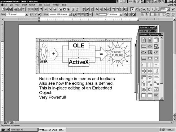 If you double-click the Visio drawing, the Word application changes, and new user interface objects are added to Word from Visio (see Figure 11.3). Notice that the Word user interface performs a metamorphosis and now has the Visio toolbars, floating dialog boxes, and menu items, as well as the Visio drawing and rulers. The user can then edit this drawing object without switching applications. In addition, these objects can be dragged and dropped between and within applications.