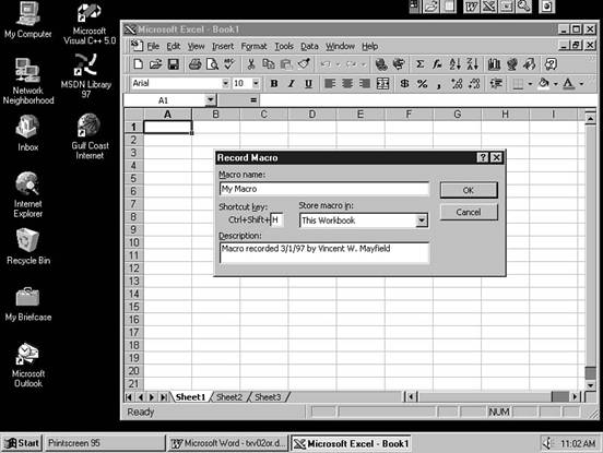 The next level of visibility to the user is OLE automation. OLE automation enables the user to access and modify objects through properties and methods, using a high-level language such as Visual Basic for Applications (VBA), VBScript, or JavaScript. This enables the user to customize objects and the interactivity between objects to perform operations the way the user defines. Microsoft Excel spreadsheets are the classic OLE automation objects. The user can create Excel spreadsheets that update a Microsoft Graph object or update information in a Microsoft Access or Borland Paradox database. The greatest part of OLE automation is that you do not have to be a programmer to take advantage of it. One example of this is demonstrated through VBA. Microsoft has made VBA easy to learn using a Macro Recorder (see Figure 11.4), which records your keystrokes in VB code, and an 'object browser,' which you use to paste the proper code where you need it. Anyone can learn to use it.