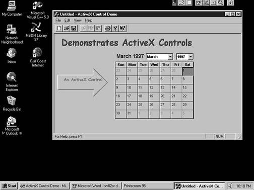 An example of a property might be the date value or the background color in the Microsoft Access Calendar control shown in Figure 11.6. A method might be a function that changes the date value or the background color. To clarify an event, the Calendar OLE control might have an event fired, when the user clicks a day, that lets the container know that a day has been clicked. These properties, methods, and events make OLE controls powerful. They give the programmer and the end user a cornucopia of functionality, as shown in Figure 11.6.