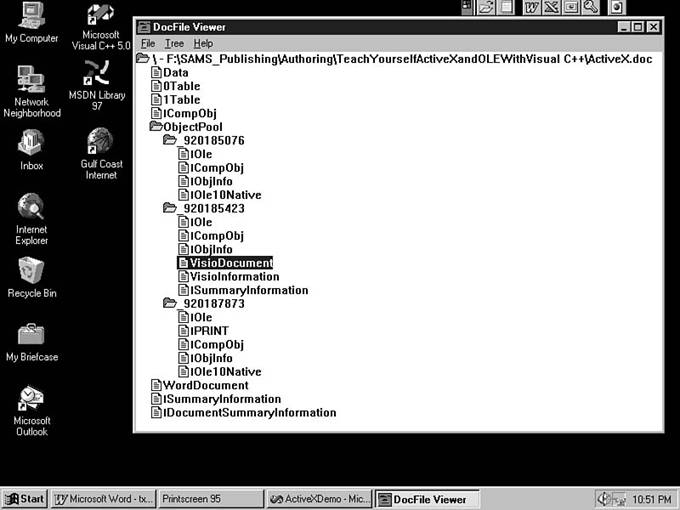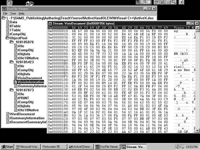 A great way to see what Structured Storage looks like is with a utility that comes with Visual C++ 5.x called DfView. DfView is in the MSDEVBIN directory of Visual C++. DfView enables you to look at a compound file also known as an OLE document. OLE documents implement Structured Storage. Figure 11.11 shows an example of DfView. (This is the Word document with an embedded Visio drawing object, shown in Figure 11.2.)