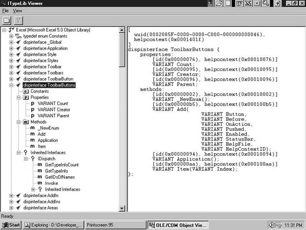 The utility in Visual C++ is called OLE/COM Viewer application. Figure 11.13 shows the OLE/COM Viewer, which can be used to view OLE and COM objects graphically.