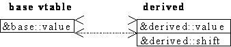 The class Base contains a single virtual function value( ), and Derived adds a second one called shift( ), as well as redefining the meaning of value( ). A diagram will help visualize what's happening. Here are the VTABLEs created by the compiler for Base and Derived: