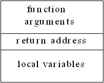 When the compiler generates code for a function call, it first pushes all the arguments on the stack, then makes the call. Inside the function itself, code is generated to move the stack pointer down even further to provide storage for the function's local variables. ("Down" is relative here; your machine may increment or decrement the stack pointer during a push.) But during the assembly-language CALL, the CPU pushes the address in the program code where the function call came from, so the assembly-language RETURN can use that address to return to the calling point. This address is of course sacred, because without it your program will get completely lost. Here's what the stack frame looks like after the CALL and the allocation of local variable storage in the function: