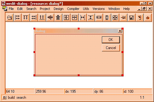 Again, we come back to the IDE, after closing our text file "dialog.rc", and we go to the "Design" menu bar and press "Open/new". The resource editor opens up, and we see the following display: