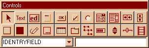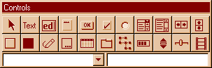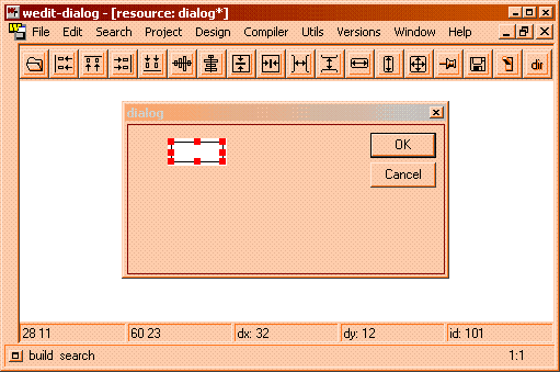 The whole operation of the editor is quite simple: The smaller window represents all the controls that you can put in a dialog box: entry fields, buttons, checkboxes, and several others. You select one button with the mouse, and drag it to your dialog box. There you drop it at the right position. To add an entry field then, we just push the edit field icon, the third one from the left in the upper row of icons, and drag it to our dialog box in the main wedit window.