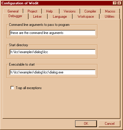 The SetWindowText API sets the caption text of a window, if that window has a caption bar of course. To test this, we have to tell Wedit to pass a command line argument to the program when it calls the debugger or executes the program with Ctrl+F5. We do this by selecting the "debugger" tab in the configuration of wedit: