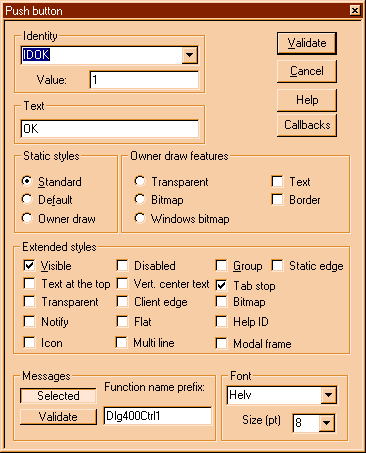 We see at the bottom a typical "messages" part: We have some buttons to choose the messages we want to handle, the function name prefix we want for all callback procedures for this element, and other things like the font we want to use when the elements are displayed.
