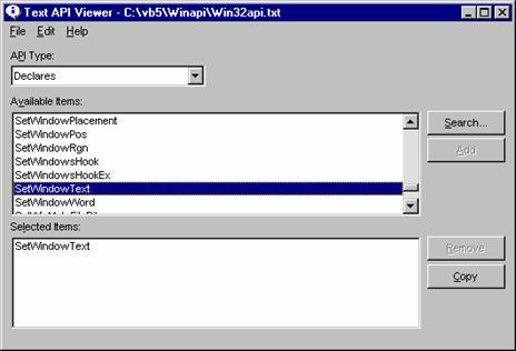 The API Viewer application enables you to browse through the declares, constants, and types included in any text file or Microsoft Jet database. After you find the procedure you want, you can copy the code to the Clipboard and paste it into your Visual Basic application.